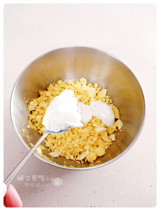 볼에 삶은 계란 3개를 넣고 포크로 으깨 준 후