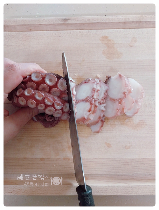 냉동 자숙 문어는 완전히 녹으면 썰기 불편합니다.