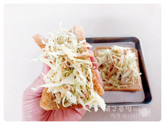 그 위에 닭가슴살 겨자 샐러드를 올리고