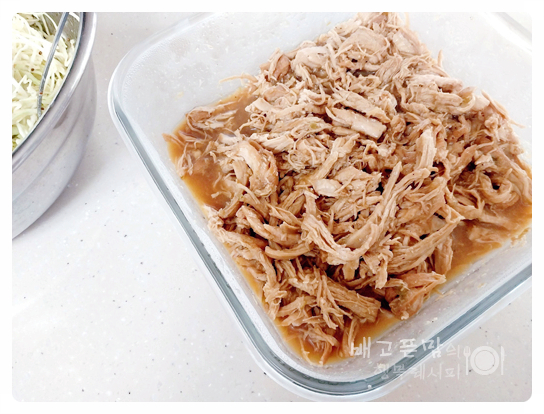 그리고 닭 가슴살을 결대로 찢어 준 후