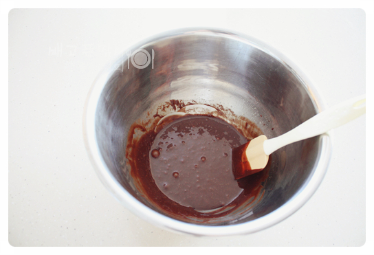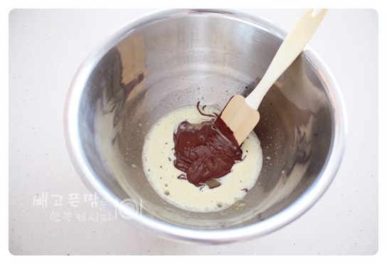 그리고 여기에 중탕으로 녹인 초콜릿 버터를 넣어 줍니다.